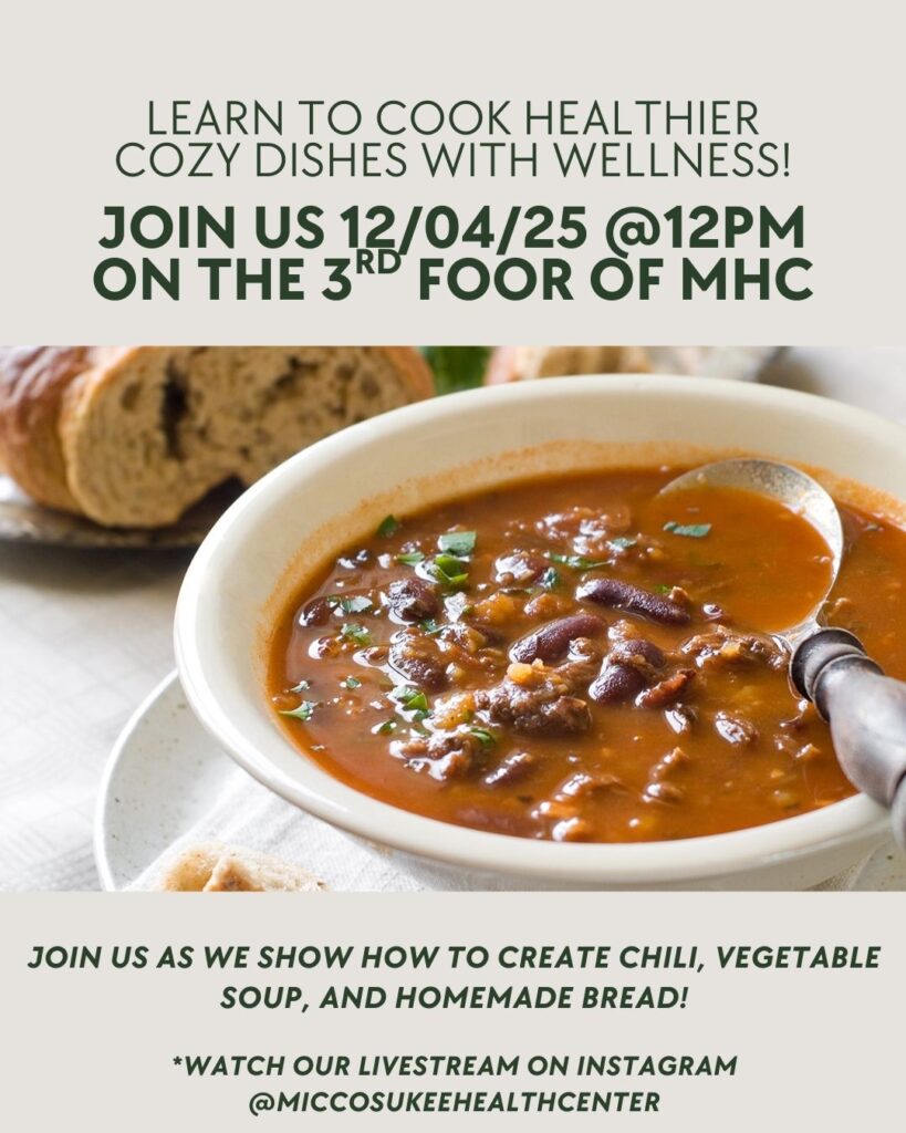 Join the Wellness Center as we show how to cook healthier, cozy dishes – chili, vegetable soup, and homemade bread!